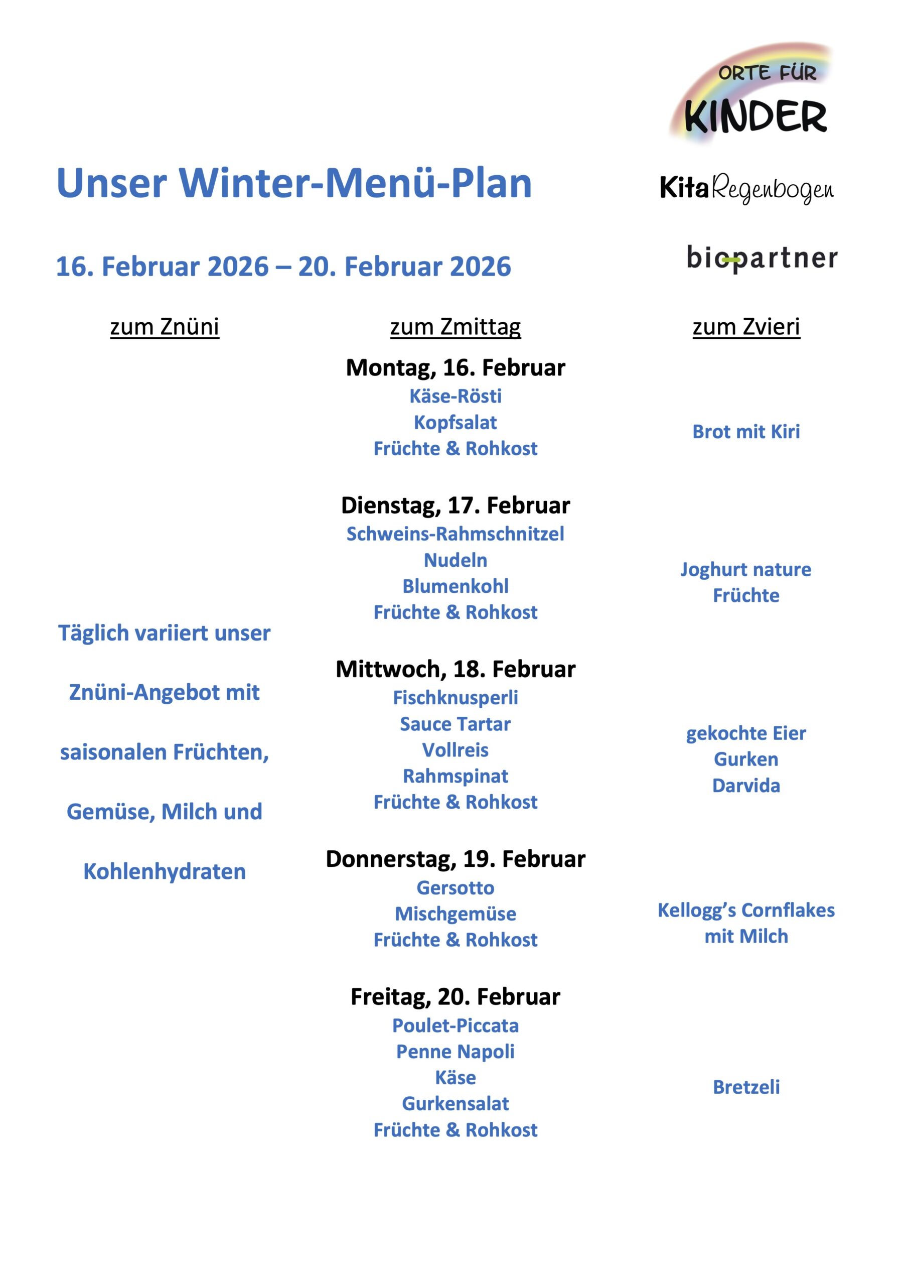 Zum Mittagessen gab es ein festliches Fasnachtsmittagessen: bunte Nudeln mit Meatballs und leckerer Sauce. Auch hier durfte die Farbe natürlich nicht fehlen – passend zu unserer fröhlichen Fasnachtsstimmung!